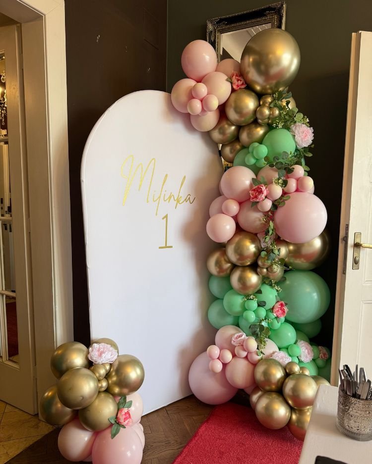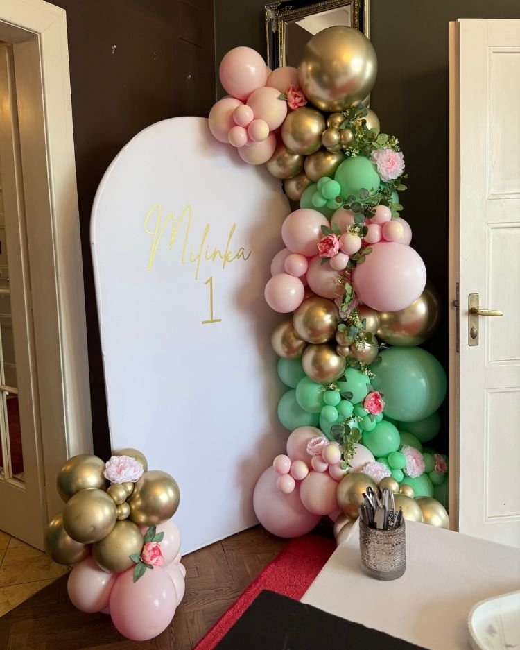Tato luxusní balónková dekorace na narozeniny je ideální volbou pro ty, kdo chtějí vytvořit výjimečnou oslavu plnou stylu, elegance a barevné harmonie. Dominantou výzdoby je elegantní bílý rám s obloukem a personalizovaným nápisem, doplněný o balónkovou girlandu ve zlaté, růžové a zelené kombinaci s živými (nebo umělými) květy.