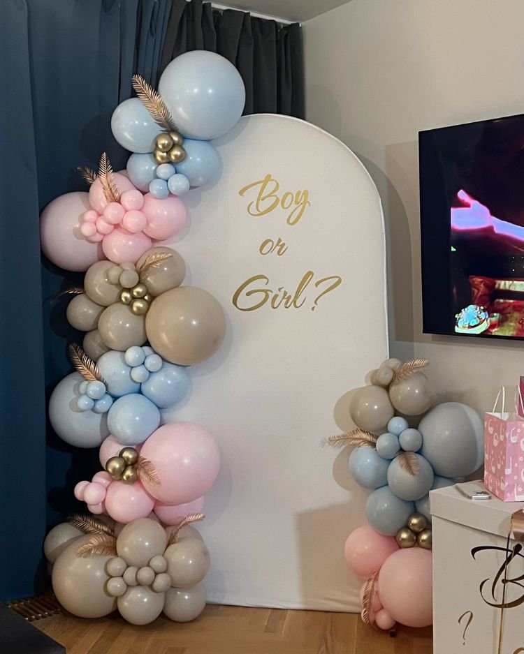Chystáte gender reveal party a chcete něco opravdu výjimečného? Tento elegantní fotokoutek s balónkovou girlandou v jemných pastelových tónech dodá vaší oslavě ten správný WOW efekt!