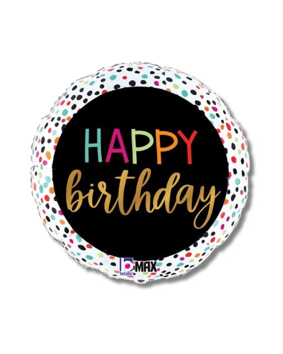 Tento veselý fóliový balónek s nápisem „Happy Birthday“ a barevnými puntíky je ideálním doplňkem pro narozeninové oslavy. Kontrastní černý střed s barevným textem a hravými puntíky kolem okraje dodává balónku zábavný a energický vzhled, který rozzáří každou party.