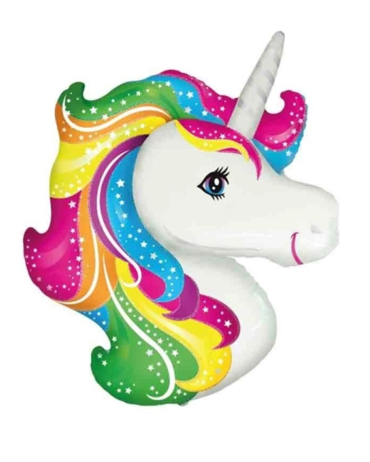 Tento produkt obsahuje nenafouknutý Supershape balónek ve tvaru hlavy jednorožce, velikost 79 x 101 cm, od společnosti Flexmetal, jednoho z předních výrobců balónků.