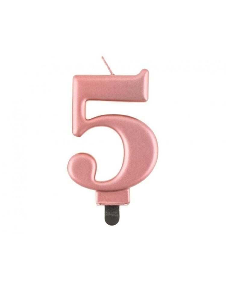 Přineste elegantní punc na narozeninový dort s touto nádhernou svíčkou číslice „5“ v metalickém odstínu růžového zlata. S výškou 8 cm je tato svíčka ideální pro vytvoření sofistikovaného vzhledu bez přehnané dominance.