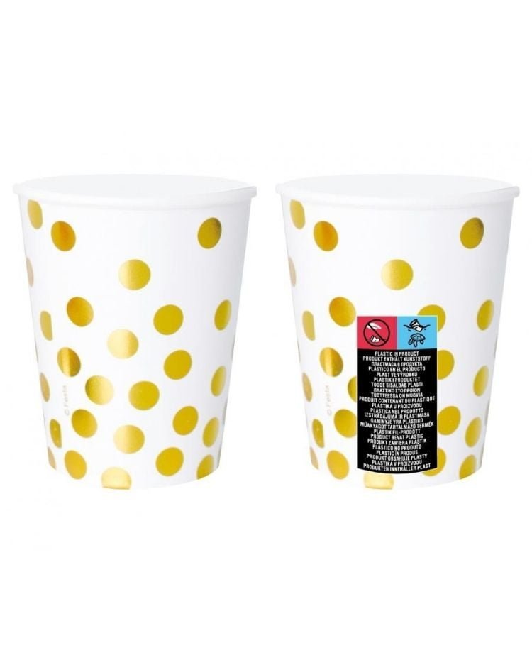 Dodáte vaší oslavě šmrnc s našimi bílými papírovými kelímky zdobenými zlatými tečkami. Tato sada obsahuje šest kelímků s kapacitou 270 ml, které jsou ideální pro elegantní podávání nápojů na jakékoliv společenské akci.