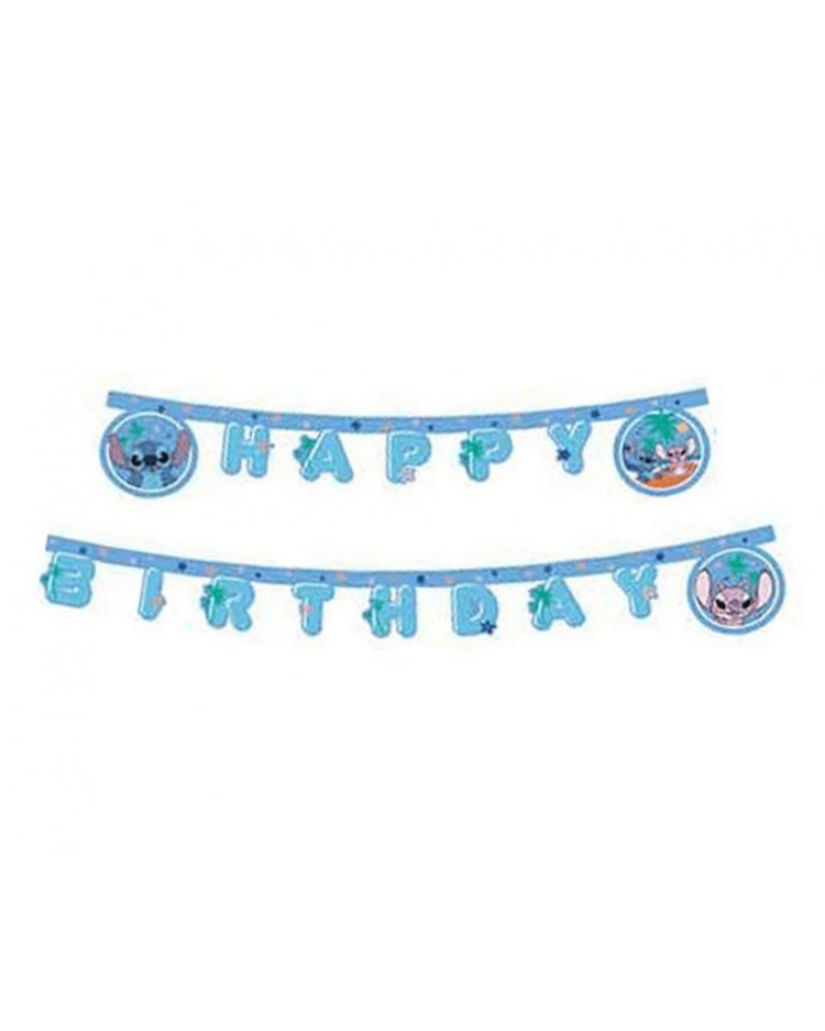 Papírový narozeninový banner Stitch & Angel Disney s nápisem Happy Birthday v modrých tónech a tropickými motivy. Skvělá volba pro výzdobu dětské oslavy s oblíbenými postavičkami.