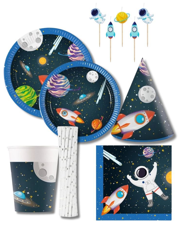 Vytvořte kouzelnou vesmírnou atmosféru s tímto tematickým párty setem plným raket, planet a hvězd. Ideální pro narozeninové oslavy a zábavné dětské párty.
